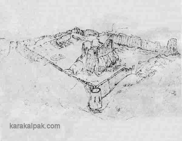 A sketch of the ruins of Teshik qala at the time of Tolstov's excavations.