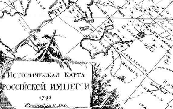 A map of the Russian Empire dated 1793 showing Lower Karakalpaks living on the north-east shores of the Aral Sea.
