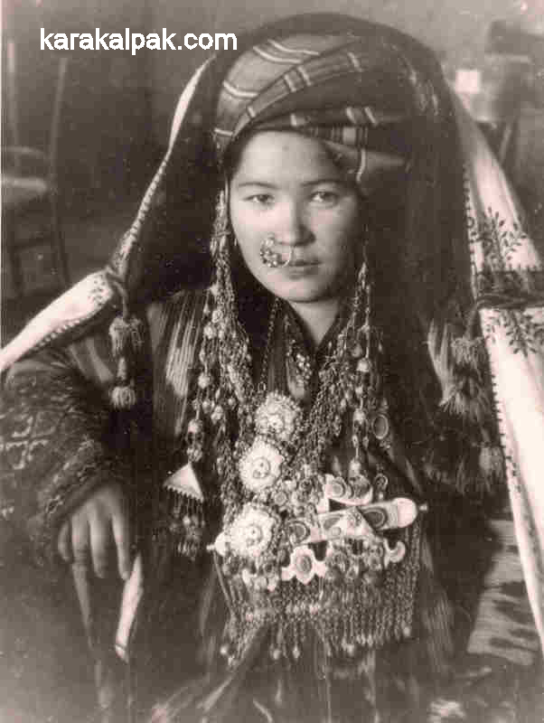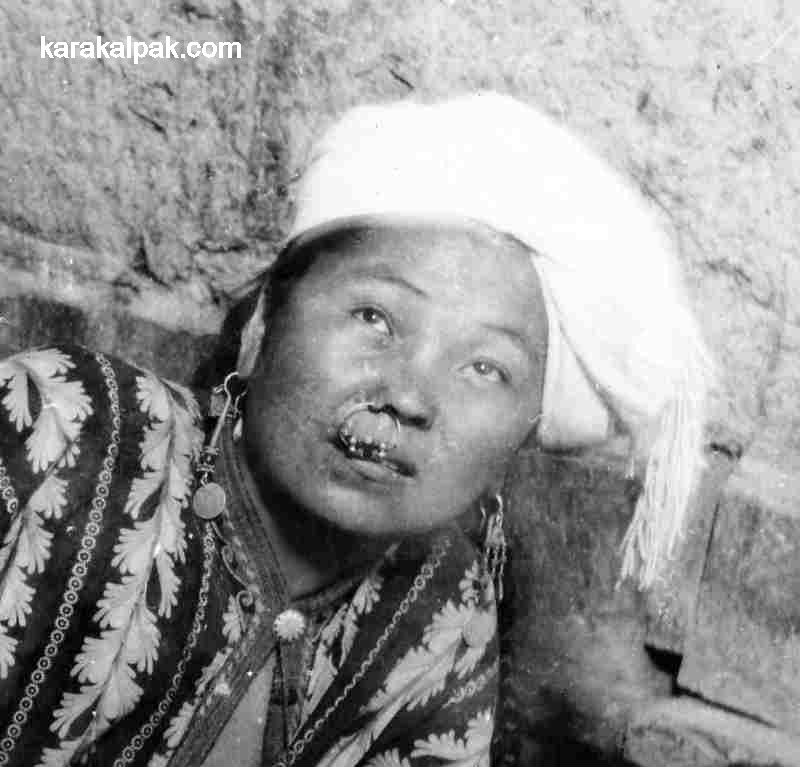 "The coastal inhabitants are Karakalpaks. Their facial features are more regular, and more beautiful than the Kirghiz [Qazaqs]. Some Karakalpak women wear a ring in the nostrils."Riza Quli Mirza saw Karakalpak women wearing nose-rings in Shımbay in 1874:
