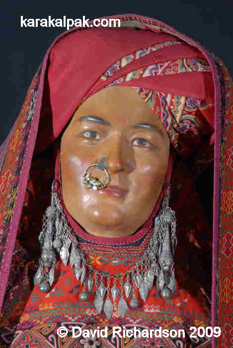 Traditional costume of a Karakalpak bride, with a'rebek nose-ring, soyaw sırg'a earrings and a dramatic