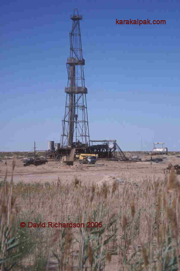 Map courtesy of the State Committee of Geology and Mineral Resources.(Click here to download a higher resolution version of this map.)The relative absence of such deposits in Karakalpakstan stands out in comparison with the mineral wealth of the other provinces of Uzbekistan. Sadly for Karakalpakstan the majority of its raw material deposits are fairly localized and small by international or even by Central Asian standards. Because of their remote location these raw material deposits do not generally justify the large capital investments required for their commercial exploitation. To date the two notable exceptions to this have been natural gas and rock salt. The discovery of major Karakalpak gas fields on the central Ustyurt plateau and under the bed of the Aral Sea during the 1990s has led to the Uzbek government upgrading this region to become the number one national priority for future investment in gas field development and production. Karakalpak natural gas is located closer to Russia’s industrial heartland and can be conveniently fed into the nearby Central Asia-Centre gas transmission lines that already cross the Ustyurt. In the last few years the Russians have taken a leading position as investment partners in the development of the Karakalpak gas industry. The fortuitous occurrence of large salt deposits close to the limestone cliffs of the Ustyurt plateau has encouraged the Tashkent government to locate a new soda ash chemical processing plant close to Qon'ırat. Once fully on-stream this plant is anticipated to supply Uzbekistan’s total needs for soda ash, an important raw material for the manufacture of glass, detergents, and other industrial products. The plant will also produce salt and sodium hydroxide. Unfortunately for Karakalpakstan the revenue raised by the sale and export of these natural resources and their derivatives is likely to end up in government coffers in Tashkent to be invested in the development of industries and infrastructure in more developed regions like Tashkent itself, or Samarkand and Ferghana. Oil and Natural GasExisting and Potential ReservesIt is possible that Karakalpakstan has some of the largest reserves of hydrocarbons in Uzbekistan. By 2004 some 20 gas fields had been discovered in the Karakalpak portion of the Ustyurt plateau. Significant reserves have also been located under the bed of the rapidly disappearing Aral Sea. The majority of these deposits have only been discovered during the last decade. As elsewhere in Uzbekistan most of the finds are in the form of natural gas rather than oil. Energy analysts estimate potential Karakalpak reserves of gas at 1.7 trillion cubic metres and potential reserves of oil at 1.7 billion tonnes.The importance of these potential new finds can be judged from the fact that in 2004 the total of all of Uzbekistan’s proven existing natural gas reserves were reported to be 1.86 trillion cubic metres. While small in comparison to Russia, which has the world’s largest proven reserves (48 trillion cubic metres), Uzbekistan’s resources are still important and are around twice those of Britain, Europe’s largest gas producer. Uzbekistan is ranked the eighteenth most important country in the world in terms of proven gas reserves. Although still somewhat speculative, total probable gas reserves are estimated at between 5 to 6.25 trillion cubic metres, of which 1.2 trillion are anticipated to derive from the Ustyurt and 0.5 trillion from the Aral Sea. At present proven reserves from both of these locations are negligible. Although Uzbekistan was a relative newcomer to the oil and gas industry it is already an important producer of natural gas, ranked within the top ten producing nations of the world. The majority of its currently operational gas fields lie in a region known to geologists as the Amu Darya Basin, a region of the Qizil Qum desert lying to the east of Karakalpakstan, between Khiva and Bukhara, and extending south through Turkmenistan as far as the Kopet Dagh. The very first Uzbek gas field at Setalantepe was only discovered in this region in 1953. The first major find – the giant Gazli field located 110 km to the north-west of Bukhara - occurred in 1956. With original reserves of about 700 billion cubic metres, Gazli is the only major gas field in Uzbekistan to be free from sulphur and also has a very low content of nitrogen and carbon dioxide. Today there are over 80 natural gas fields in Uzbekistan with 12 major deposits, of which Gazli, Shurtan, and Kokdumalak in the Amu Darya Basin are the largest. The Gazli field, which can be seen from the road between No'kis and Bukhara, is currently still the biggest producer of natural gas. The second largest production is from Shurtan, to the east of Bukhara, which began producing in 1980 and accounted for 36% of Uzbekistan's natural gas production in 2000. About 80% of current Uzbek gas production comes from the Amu Darya Basin. The other two important regions are the Ferghana Valley and the Murabek area in the south-west of Uzbekistan. The oldest gas field in Karakalpakstan is at Shaxpaxty on the Ustyurt plateau, in the south-west of the Autonomous Republic to the west of the Sarykamysh Lake. Operations at Shaxpaxty began in 1962 and its reserves at that time were estimated at 40 billion cubic metres. A feeder pipeline was constructed running north from Shaxpaxty to the Karakalpakia compressor station linking it to the Central Asia-Centre pipeline. However production at Shaxpaxty was halted in February 2002 because of the obsolescent state of equipment at the compressor station, by which time some 8 billion cubic metres of the reserve had been extracted. In the early 1990s exploration work began at an accelerating pace across the dried-up bed of the Aral Sea in Karakalpakstan, and on the nearby Ustyurt plateau. By 2001 test rigs could be seen dotted right across the former seabed lying to the north of Moynaq. The Qazaqs too began exploration work 