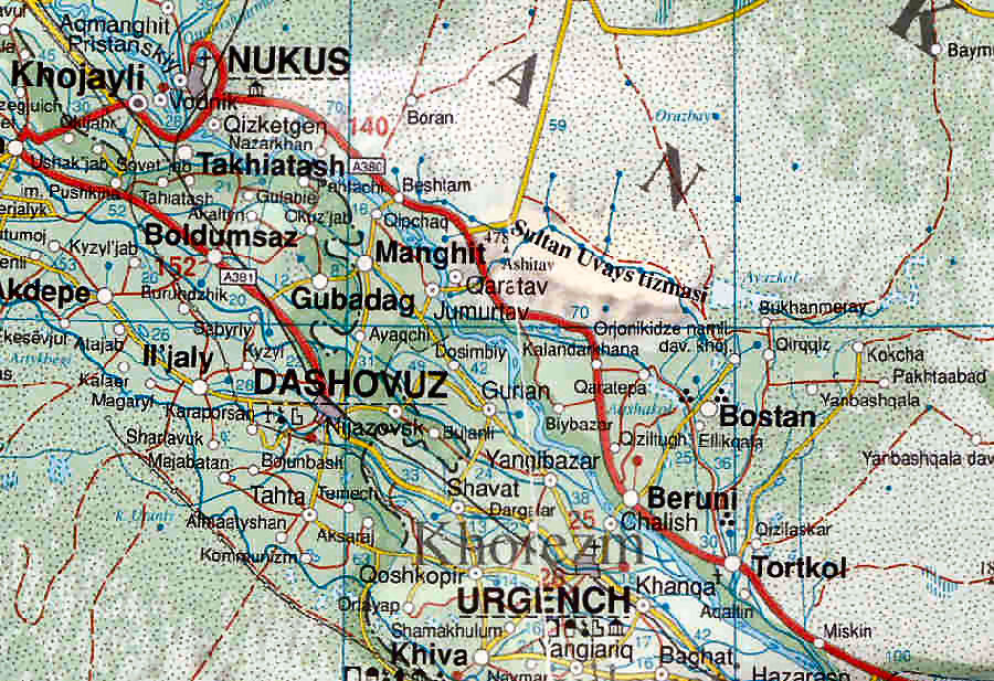 Today the only metalled road links are to Bukhara and to Ashgabat. The former crosses the southern Qizil Qum and is wide and in generally good