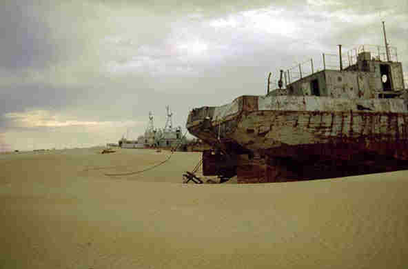 Rotting Soviet naval ships at the dried-up port at Aralsk-7 on Vozrozhdeniye Island.