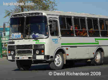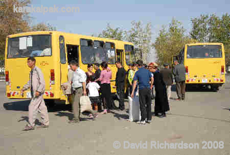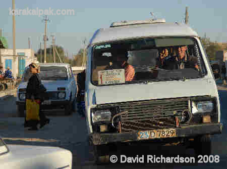 The very crowded No'kis to Shımbay bus picking up passengers along the roadside on a Sunday morning.